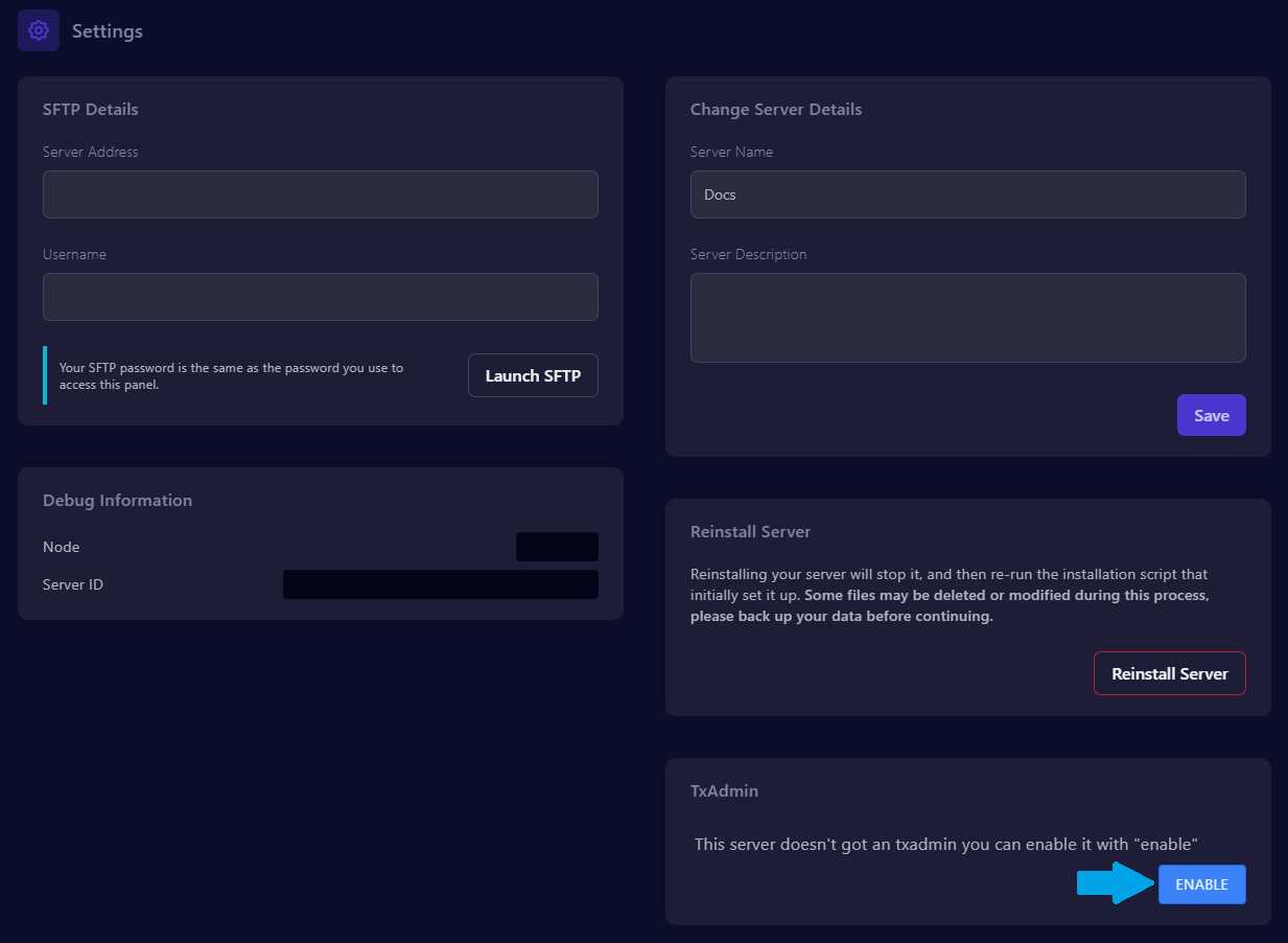 3. Click the "**enable**" button located in the "**TxAdmin**" section.